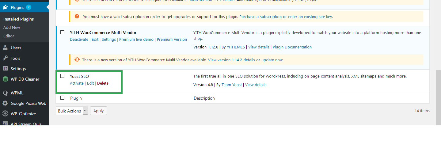 4. Once the Yoast SEO plugin is installed, hover your mouse again to the ‘Plugins’ on the left, and this time, click on ‘Installed Plugins.’ You will see all the installed plugins here, including the Yoast SEO plugin. Just click ‘Activate’ under the Yoast SEO in order to activate the plugin.